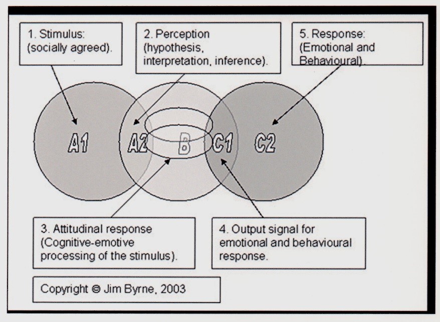 This model shows (at box 1, [A1]) that an incoming stimulus (impacting the sense organs of a person) is already ‘socially agreed’ – because the person has been socialized by his/her family of origin to perceive in particular ways. The person interprets the stimulus (at box 2, [A2]), but this interpretation is driven by their emotive-cognitive processing of the stimulus (as in box 3, [B1, 2, 3]). But, once we include emotive processing at point B in this model, then the simple ABC model is dead, because the simple ABC model says that it is only a belief (a language-based idea) that mediates between the A and the C!